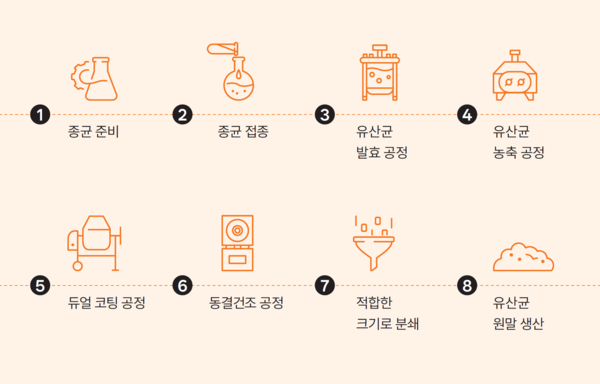 발효를 마친 유산균은 농축 단계를 거쳐 '듀얼코팅' 공정에 들어간다. 회사 측에 따르면, 듀얼코팅 기술은 유산균보다 작은 입자를 겹겹이 배치해 위산으로부터 균을 보호하고, 장에서 자연 분해되어 생존율을 높이는 구조다.
