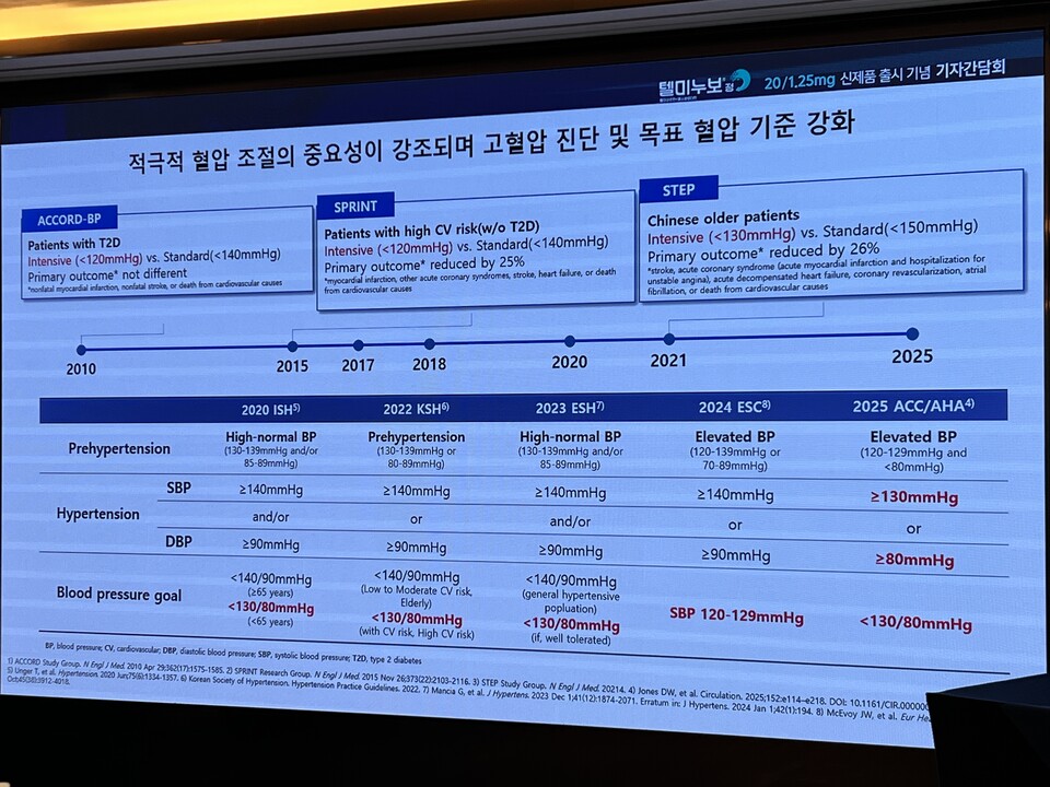 이번 간담회는 한양대학교병원 순환기내과 신진호 교수가 좌장을 맡고, 서울아산병원 심장내과 김대희 교수가 연자로 참여해 국내외 고혈압 가이드라인 변화와 텔미누보 저용량 전략의 임상적 의미를 짚었다.