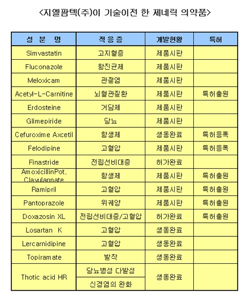 지엘팜텍(주)은 최근까지 6건의 의약품 제제관련 특허를 취득했으며, 특허를 출원해 심사 중인 특허도 14건에 이르고 있다. 또한 개별 특허의 경제적인 가치도 상당히 높은 것으로 평가되고 있다. 이러한 성과를 바탕으로 지엘팜텍(주)은 지난해 말 한국발명진흥회에서 개최한 ‘특허기술 사업화 성공사례 발표회’에서 특허청장상을 수상하기도 했다.
