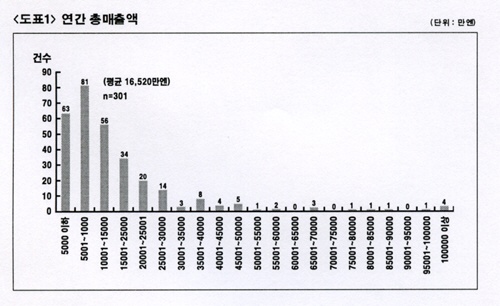 매출액을 금액별로 보면 ▶5,000만 엔 이하가 21% ▶5,001만 엔~1억 엔 27%로 거의 절반의 점포