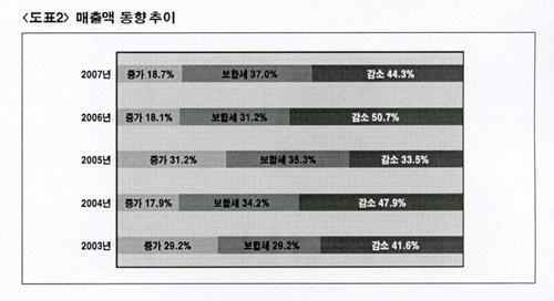 연간 매출액 평균은 1억6천520만 엔(유효 답변 수 301건)으로 전년도의 1억7천113만 엔에 비해 3.5% 감소했다. 그러나 매출이 ‘감소했다’고 느끼는 사람의 비율은 44%로, 전년도의 50.7%보다는 적었다. 2007년은 2006년과는 달리 조제 보수의 개정이 이루어지지 않았던 때문인지 ‘보합세’(37%)라고 대답한 비율이 증가했다.