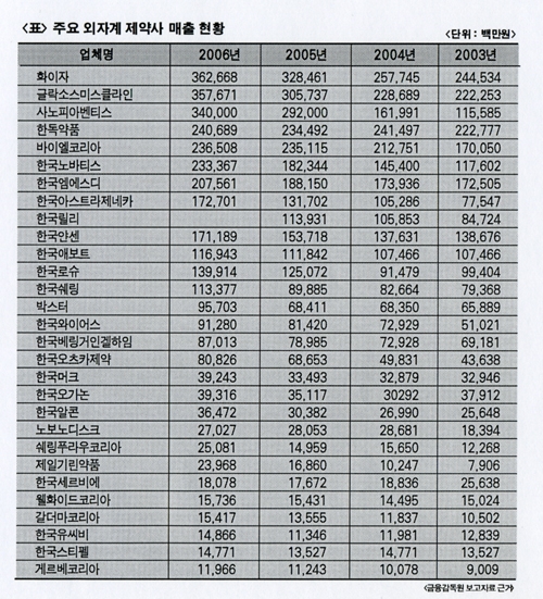 본지가 조사한 자료에 의하면 일부 제약사들을 제외하고는 다국적제약사들은 지속적인 성장세를 나타냈다. 한국화이자의 경우는 지난 2005년도에 -0.93%의 성장률을 보였지만 2006년도에는 15.90%의 성장을 나타냈다. 또한 한독약품의 경우에도 지난 2005년도에 -2.93%를 나타냈지만 2006년도에는 2.64%를 기록했다.