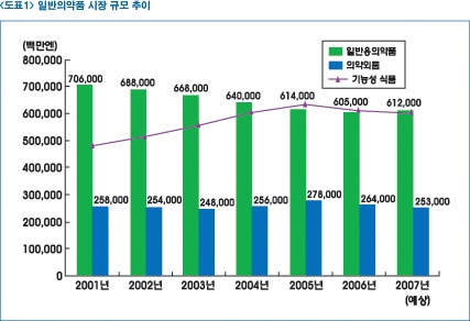 건강식품ㆍ시리즈 영양식을 대상으로 한 기능지향 식품시장은 2005년을 기점으로 2006년에는 전년 대비 다소 감소했으며 더욱이 2007년에도 마이너스로 전환했다.