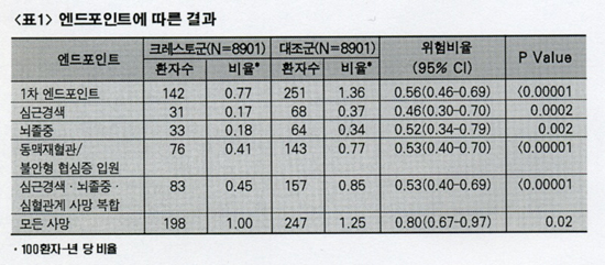 이 연구는 5년간 지속되도록 고안됐지만 독립적 모니터링위원회에서 크레스토 복용군이 대조군에 비해 월등한 효과를 보인다며 종결 권고를 내려 지난 3월에 중단됐으며 평균 후속기간은 1.9년(최대 5.0년)이다.