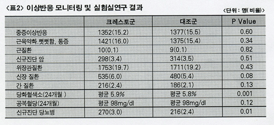 안전성 면에서는 근질환(myopathy) 및 암 위험이 크게 증가하지 않았지만 의사들이 보고한 당뇨병 발생 사례는 더욱 많은 것으로 나타났다(3.0%:2.4%)<표2 참조>.
