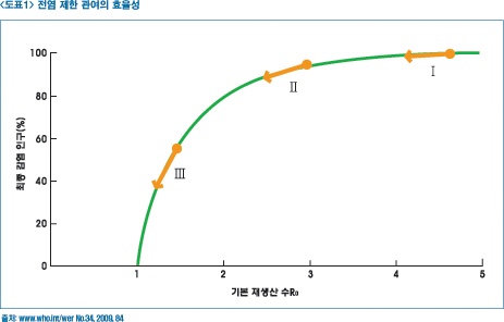 R0가 낮을수록 관여를 통해 감소하게 되는 최종 감염 인구비율이 크게 감소한다. R0가 5인 I의 경우는 공격률을 1%, R0가 3인 II에서는 6%, R0가 1.5인 III에서는 27%까지 낮출 수 있다. 예를 들어 이 커브를 통해 백신으로 직접적으로 인구의 20%를 보호할 경우 직접 보호되지 못 하는 사람들에 대한 효과를 예측할 수 있다.
