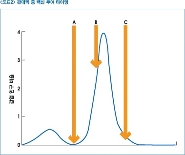 B는 선진국들에서 가능성이 높은 시나리오로 판데믹 2차 파동 이후 접종이 이뤄지게 된다. C는 2차 파동이 끝날 때까지 백신이 접종될 수 없는 상황으로 북반구와 남반구의 많은 개발도상국 및 과도기적 국가들에서 일어날 가능성이 높다.