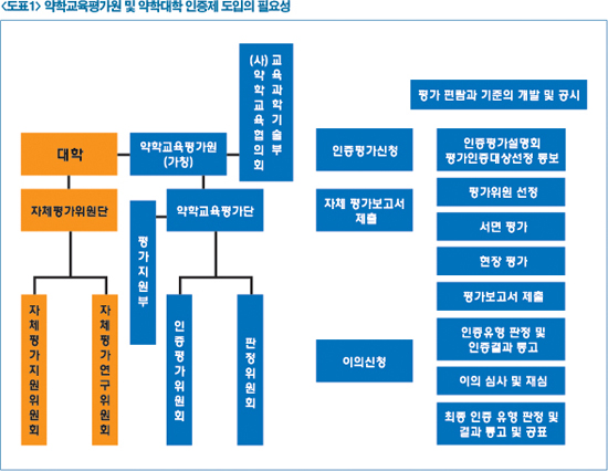 대학평가가 시작된 이래 평가 인증과 관련해 정부는 일관되게 자체 또는 제3의 기관이 인증평가를 실시하게 해왔다. 약학교육 인증평가 역시 정부는 조력자 이상의 역할을 원하지 않는 상황에서 평가인증의 주체는 약교협일 수밖에 없다.