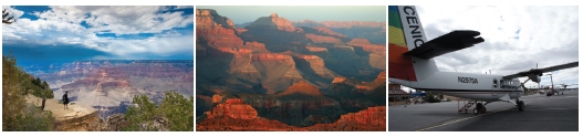 11월 중순부터 눈이 내리기 시작해 3월 하순까지 절벽 남쪽에 남아있는 눈을 볼 수 있다. 일교차가 심해 여름에도 저녁 무렵에는 일시적으로 기온이 내려간다. 어느 때 방문하더라도 항상 점퍼나 재킷을 준비하는 것이 좋다.그랜드 캐니언 경비행기 투어그랜드 캐니언을 경비행기를 타고 공중에서 관광하는 투어이다.