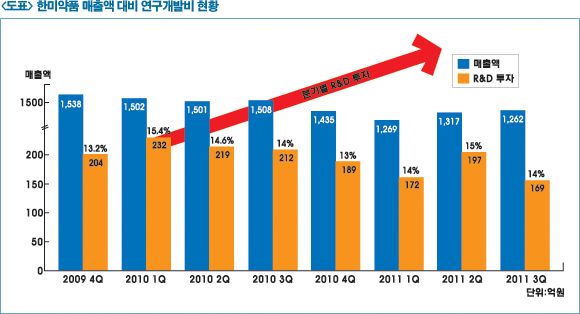 정부의 지속적인 약값인하 정책으로 제약기업 전체의 이익률이 하락했음에도 불구하고 한미약품은 2011년 한해동안 전체 매출의 13.9%인 840억원(연결재무재표 기준)을 R&D에 투입하며 대한민국 최초의 ‘글로벌 신약’ 탄생 의지를 불태우고 있다.