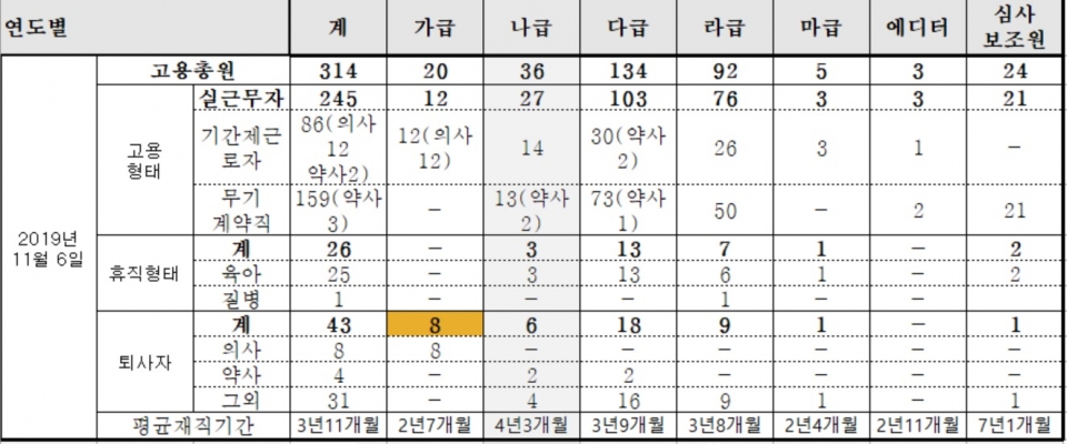 하지만 연도별 재직기간 역시 다른 심사 인력에 비해 현저히 낮은 수준이었다. 가급 의사 심사관의 평균 재직기간은 2016년에 1년5개월, 2017년 1년9개월, 2018년 1년7개월, 2019년 현재 2년 7개월을 기록했다. 하지만 다른 직역(나~마급 심사관, 에디터, 심사보조원)의 평균 재직기간은 같은 기간인 2016년 3년7개월, 2017년 3년3개월, 2018년 3년2개월, 2019년 3년11개월로 의사 심사관의 재직기간보다 길었다.